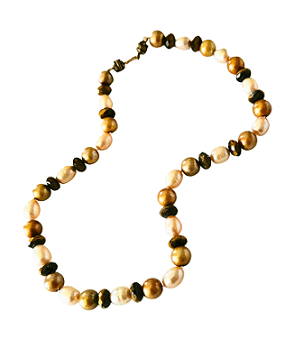 I remade this necklace as it was too plain with only bronze Pearls. Now with the alternating white and bronze coloured Pearls it is much more zappy. But it still needed a little more contrast so I added faceted discs of Tiger Eye. The necklace then has different shapes and contrasting colours. The Filagree catch is really pretty and just fits in with the colours and if you’re a gold person then this will feel good on your neck. Pearls are for girls it is said and are known for sincerity and integrity. the Tiger Eye is quite masculine so here is a balancing of the two, a yin/yang energies giving you the impetus to be true to yourself.